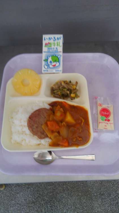 今日の献立は、豚肉と金時豆のカレーライス、焼きハンバーグ、ごぼうサラダ、マヨネーズ、パインアップル、牛乳です。