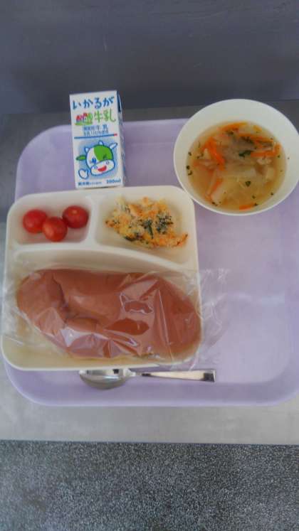 今日の献立は、ほたて貝のグラタン、だいこんのスープ、プチトマト、パン、牛乳です。