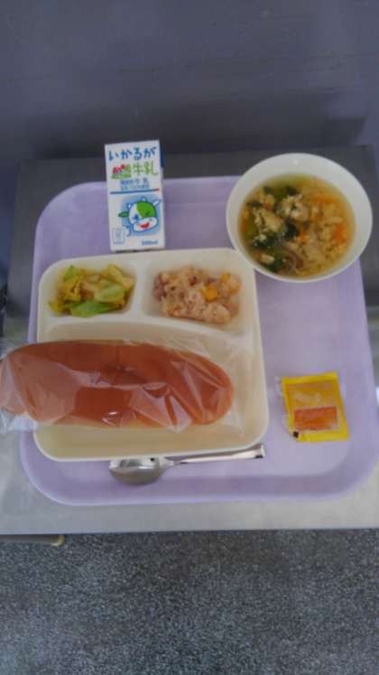 今日の献立は、中華おこわ、卵スープ、キャベツのオイスターソースいため、パン、あんずジャム、牛乳です。