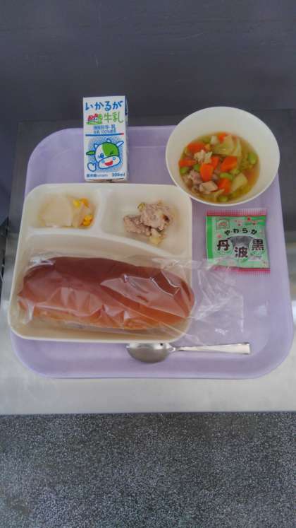 今日の献立は、まぐろのしょうゆマヨネーズ焼き、鶏肉とじゃがいものスープ煮、だいこんのサラダ、ソフト黒豆、パン、牛乳です。