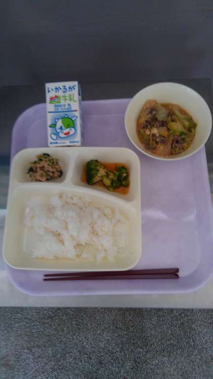 今日の献立は、すき焼き煮、ブロッコリーのしょうがづけ、ツナっ葉いため、ごはん、牛乳です。