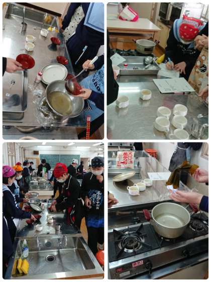2年生の家庭科の授業で一番だしを作り、塩加減をみながら味を調えてすまし汁を作りました。作っている間に、こんぶだし、かつおだし、顆粒だしをそれぞれ味見し、どれがどのだしであるかを当ててもらうこともしました。香りや色、風味をしっかりとみて、ほどんどの人が正解でした。塩を入れすぎてしまった班もいましたが、「簡単だったまた家でもやってみたい」「おいしかった」「顆粒だしの便利さを知った」という感想の生徒もいました。だしを取ることが少なくなってきている昨今、日本の文化のだしについて少しでも生徒たちの中に残ってくれるといいなと思います。