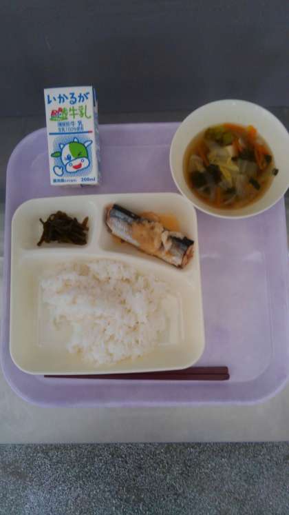 今日の献立は、さんまのみぞれかけ、すまし汁、茎わかめのつくだ煮、ごはん、牛乳です。