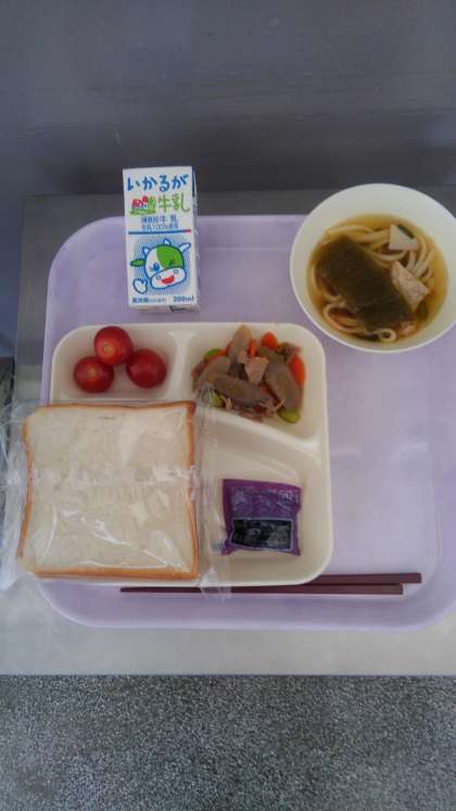 今日の献立は、豚肉とごぼうの煮もの、なにわうどん、プチトマト、パン、ブルーベリージャム、牛乳です。