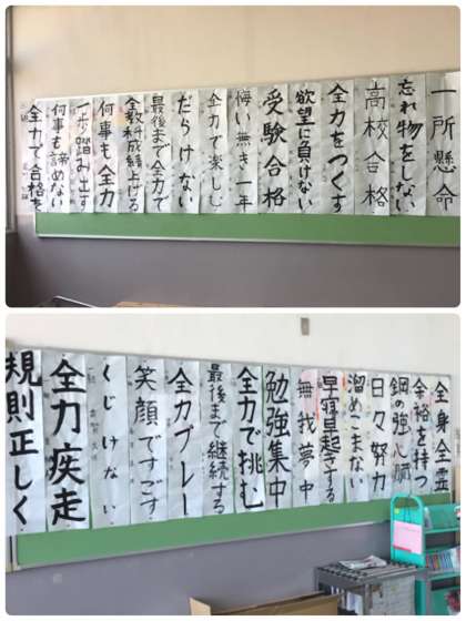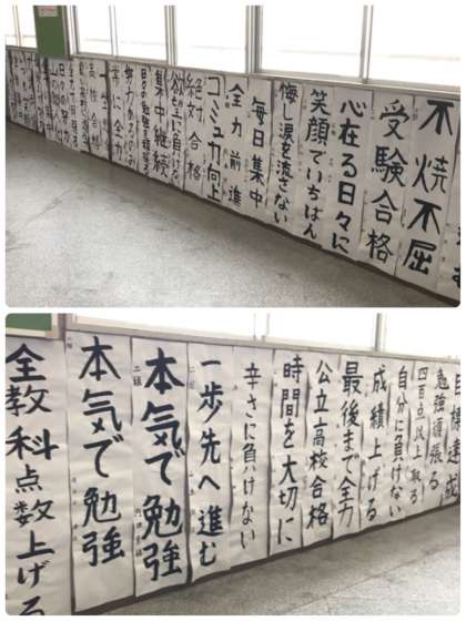 3階2年生のホールに、国語科の授業で行った書き初めが飾られています。