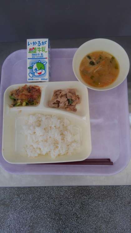 今日の献立は、豚肉のごまだれ焼き、みそ汁、こまつなのおひたし、ごはん、牛乳です。