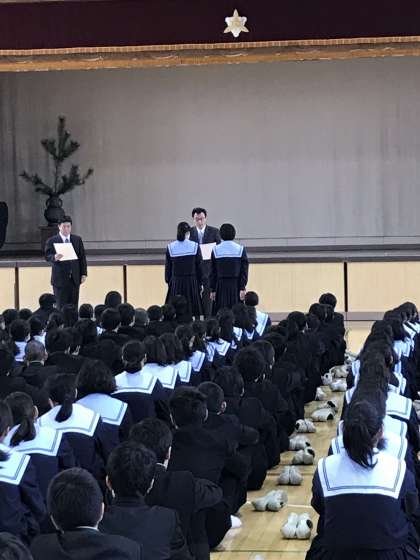 修了式では、各学年の1組出席番号1番の生徒が呼ばれ、代表として、修了証を受け取りました。