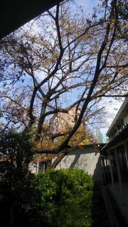 野田中学校には、正門付近からは目にすることができませんが、体育館裏の新家公園側に桜の木が植わっています。先日の入学式のときには、まだつぼみでしたが、今日の陽気に誘われて花を咲かせ始めました。