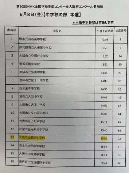 昨日行われたNHK全国学校音楽コンクール、大阪府予選に参加した音楽部が、見事に予選を通過し、8日に行われる本戦出場が決まりました。