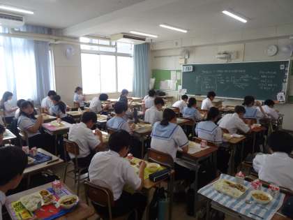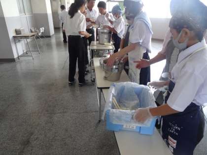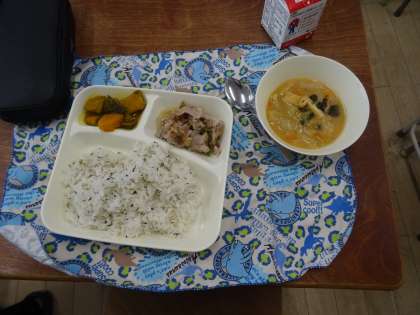今日のメニューは菜飯、豚肉の甘辛焼き、かぼちゃのいとこ煮、みそ汁でした。
