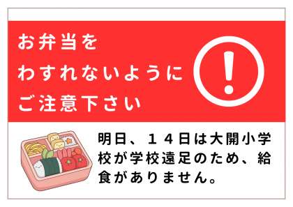 明日は給食がありません。お弁当を忘れないようにしましょう。