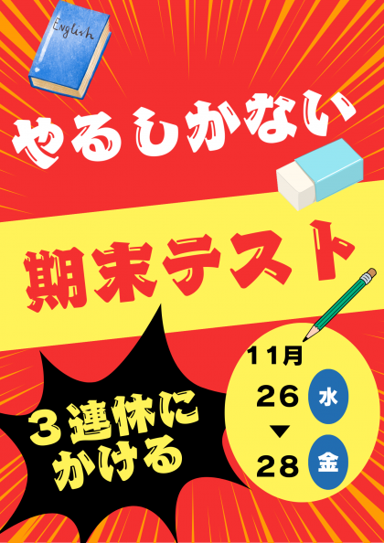 明日からはテスト前の大切な3連休です。粘り強く、計画的に勉強に取り組みましょう。