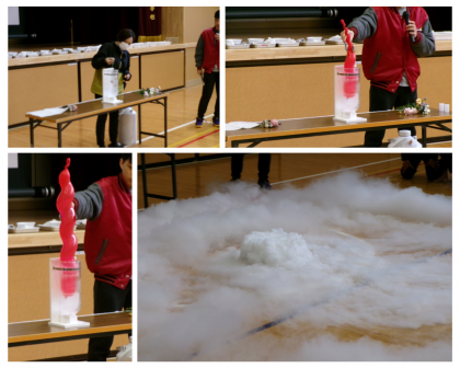 液体窒素をお湯の中に入れると雲が発生しているようになる様子や、風船を入れるとしぼんでいくが外に出すと元の大きさに戻るという不思議な世界を体感しました。