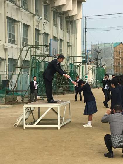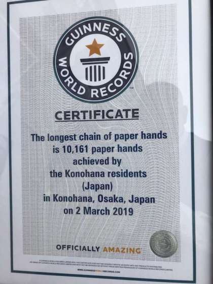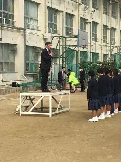 本日の全校集会で此花区の前田区長をお迎えし、生徒たちに講話をしていただきました。また、ペーパーハンドチェーンのギネス記録を達成した賞状をいただきました。