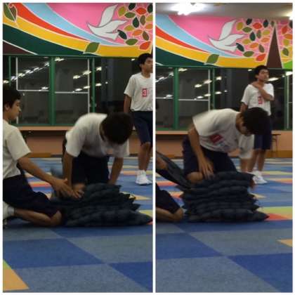 上の人が跳ぶ間に、10枚重ねの座布団を抜いていきます
