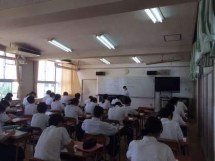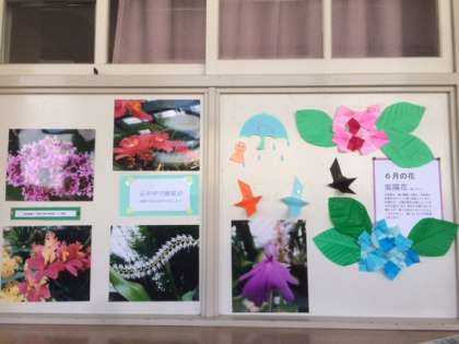 全員揃って音楽室での授業は今日が初めてでした。図書室前の掲示物は梅雨模様ですが、今日はさわやかな朝でした。