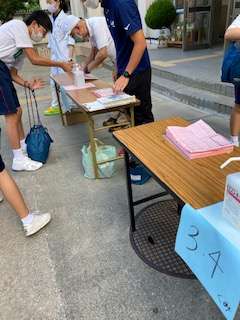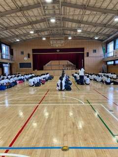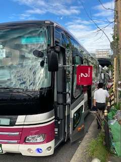 体育館で出発式をして、予定より少し早くバスは出発しました。青空が見えています。