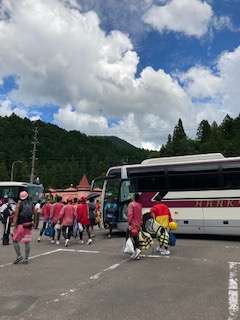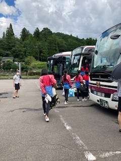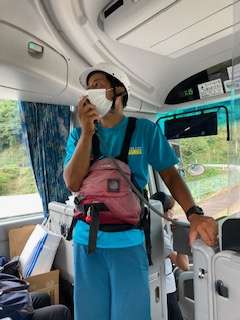 ラフティングに向けて準備が整いました。これから出発地点までバスで移動します。 車内でリーダーのコジコジさんの注意を聞いています。