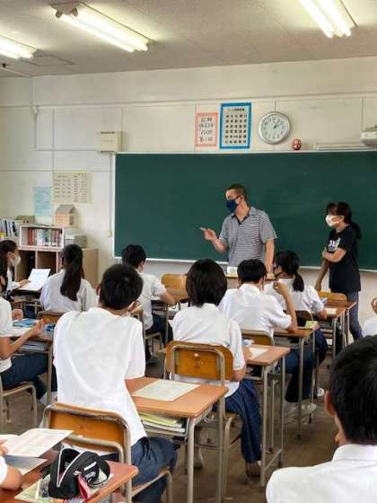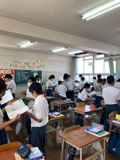 1枚目:1年生英語では、教科書の対話文をペアになって音読をしています。