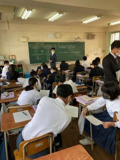 6時間目は教育センターより豊岡先生にお越しいただき、1年数学授業を参観していただきました。近くの人と解き方を共有している場面もありました。