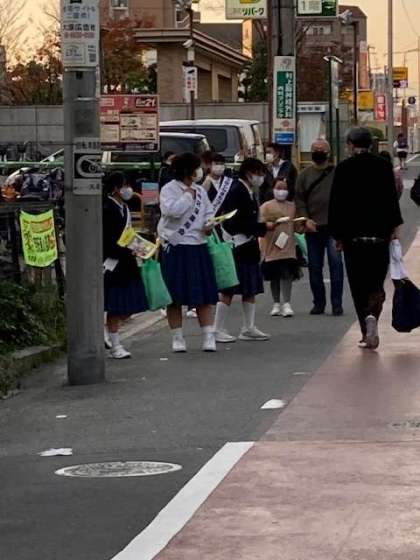 今日の放課後、生徒会メンバーは、此花区保護司会の皆様、高橋区長の街頭啓発活動に参加しました。西九条駅前で、通りを歩いている人にチラシとお菓子を配ります…勇気を出して…。