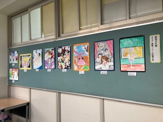 1枚目:職員室前廊下に美術部の作品を展示していただきました。力作ぞろいで雰囲気が一変しました。