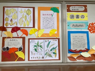 2枚目:図書館前の掲示です。図書館補助員の先生が彩り鮮やかな掲示を作成してくださいました。