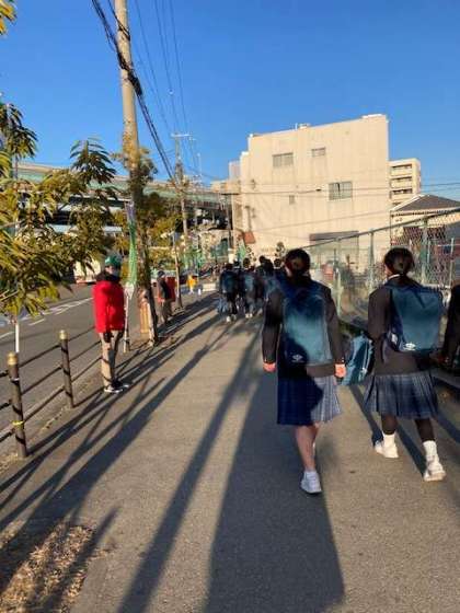今日は土曜授業です。冷え込む中、此花区青少年指導員の皆さまが登校を見守ってくださいました。
