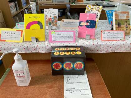 図書室の受付です。図書館補助員さんがいつも楽しい本の展示をしてくださいます。