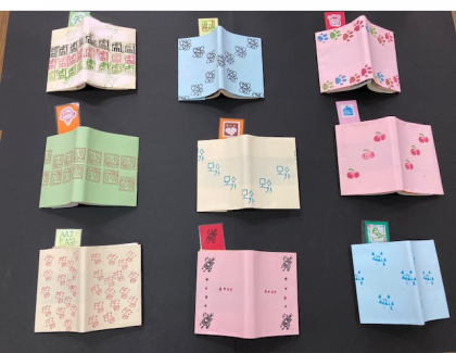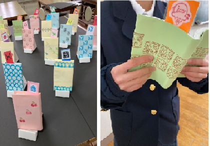 一人一人が考えたデザインで「ハンコ」を作成し、ブックカバーやしおり、カードを作りました。文庫本サイズです。どう並べて押すか?にも工夫が見られますね。