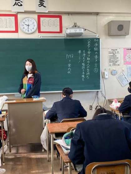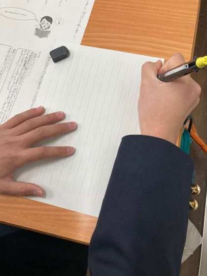 2年生国語の授業では「受け取る人の気持ちを考えて敬語で手紙を書こう」を目標に学んでいました。普段メールなどで済ませることが多くなっています。敬語をきちんと使って、時候の挨拶、感謝を伝えて、お礼の言葉を考えて…そしてていねいに清書に入ります。