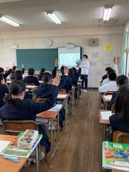 1年生社会の授業。前回学習した「緯度」を振り返り「経度」についての学習です。