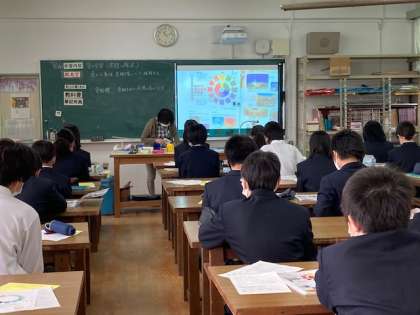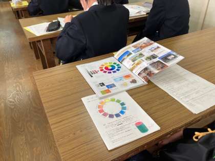 1年生の美術の授業。色についてプリントと前の画像で学習しています。