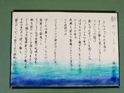 2枚目:サポートクラス生徒制作「谷川俊太郎『朝のリレー』」本館2階廊下に展示しています。