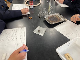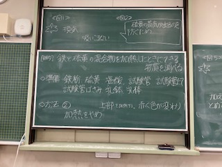 2年生理科の授業「鉄と硫黄の混合物を加熱したときにできる物質を調べる」実験です。
