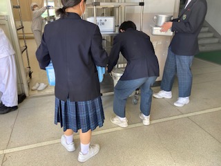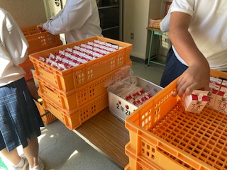 給食後の配膳室の様子です。給食当番が教室から運び返却します。牛乳パックは空のものをかごにまとめます。当番の生徒が「ごちそうさまでした」「おいしかったです!」と言ってくれてうれしいです…と配膳員さんにお褒めの言葉をいただきました。