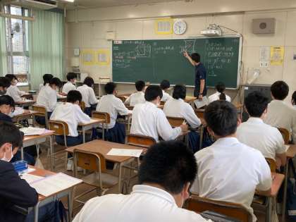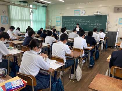 今日、明日は午前中4時間の授業です。写真は2時間目3年生の教室です。数学、社会、英語の授業。どのクラスも3年生としての自覚が感じられる授業態度でした。健康管理をしっかり行い、午後は家庭で課題に取り組みましょう。