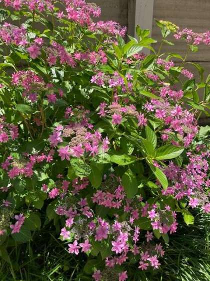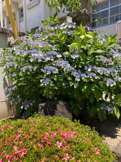 校門を入ってすぐ左のアジサイが満開です。桃色のアジサイは校門入って左側の植栽です。