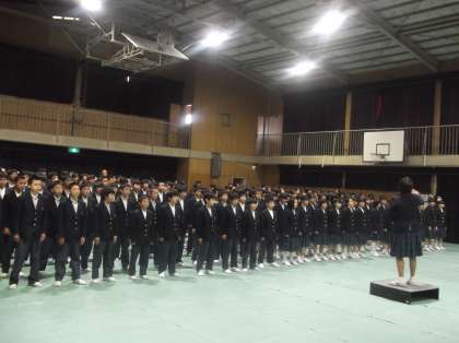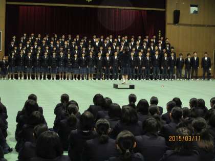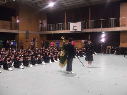 明日の卒業式を前に、生徒会による「送別の式」が行われました。校旗受け渡しの後、代表生徒のあいさつ、在校生の歌、卒業生の歌が続きました。一人ひとりの思いがこもった歌が体育館に響き渡りました。