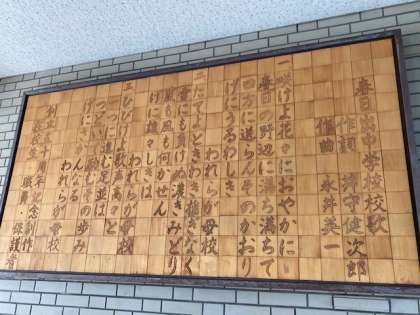 玄関にある校歌のレリーフです。創立50周年記念制作とありますので約24年前の制作でしょうか。本校は昭和22年(1947年)創立、今年は74年目にあたります。