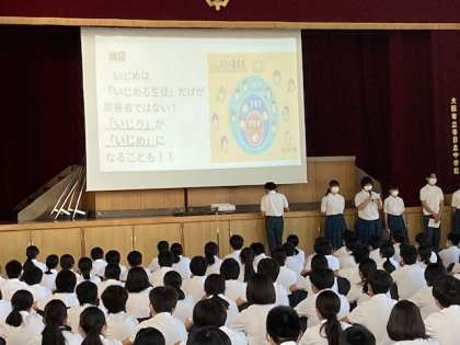 生徒会メンバーで企画・作成したスライドで思いを訴えたあと校長先生からのお話を聞きました。
