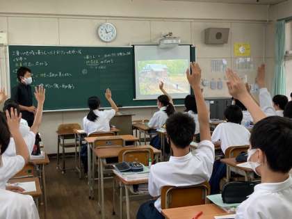 写真をみて、先生からの「なぜ高床の住居になっているのだろう?」の問いに多くの手があがりました。様々な角度から考えた発表が次々とでました。