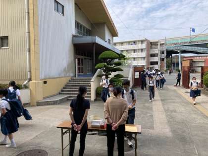 登校時には、玄関で「健康観察表」を一人ひとりチェックしています。