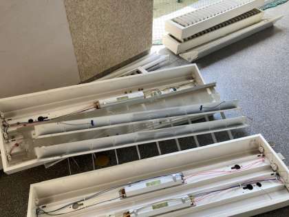 夏休み中に教室の電灯を目に優しいLED照明に付け替える工事をすすめています。