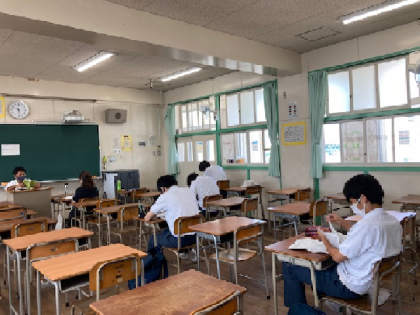 3年生教室:自主的に学習に来ている人。学校でやるとわからないところもすぐに先生にたずねられますね。まだ7月…と思わずに頑張っていることが必ず9月に実ります。