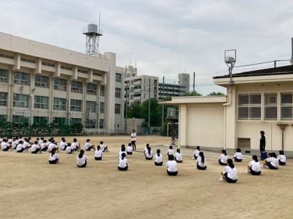 1年生体育の授業:先週の体育大会全体練習の振り返りを行っています。