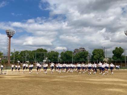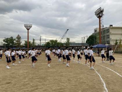 2年生学年練習:少し曇ってきた空の下、学年体育委員長の指示をよく聞ききびきびと動きます。