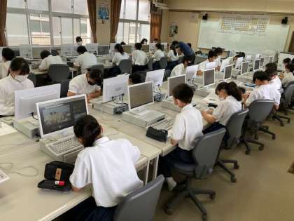 1年生技術:パソコン室で世界中のユニークな形の建造物を検索中。この後のモノづくりの学習につながります。