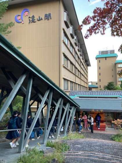 予定より少し早く、今日の宿舎「おもてなしの宿 渓山閣」に着きました。消毒をしてから入館します。全員元気です。