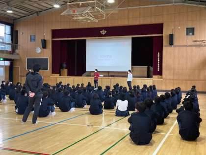 1年生 学年集会:今月末の校外学習についてお話を聞きます。